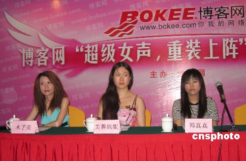 七月五日,由博客網(wǎng)主辦的“超級女聲重裝上陣”活動(dòng)新聞發(fā)布會在北京舉行。備受中國內(nèi)地網(wǎng)民關(guān)注的歌手韓真真(圖右1)全程代言此次比賽。“網(wǎng)絡(luò)紅人”木子美、芙蓉姐姐、流氓燕、竹影青瞳等作為嘉賓進(jìn)行全程賽況點(diǎn)評。