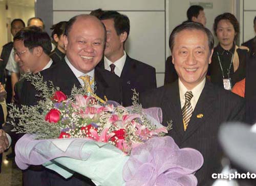 新黨大陸訪問團(tuán)今天上午從臺北啟程,乘坐華航飛機(jī)抵達(dá)香港后,再轉(zhuǎn)乘CZ三0四航班于當(dāng)日下午二時(shí)四十分飛抵廣州白云機(jī)場。中共廣東省委常委、秘書長肖志恒和中臺辦主任助理張銘清、廣東省臺辦主任甘兆勝等到機(jī)場迎接郁慕明,雙方握手寒暄后,一位廣州女青年向郁慕明獻(xiàn)上鮮花。郁慕明及訪問團(tuán)一行在機(jī)場貴賓室作短暫停留后,乘車前往下榻的廣州東方賓館。