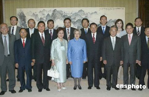 七月六日,中國國務院副總理吳儀在北京中南海會見率團來京參加“海峽兩岸信息產業技術標準論壇”的華聚產業共同標準推進基金會董事長江丙坤,并與訪問團一行合影。中共中央臺辦主任陳云林出席會見。作者:史利