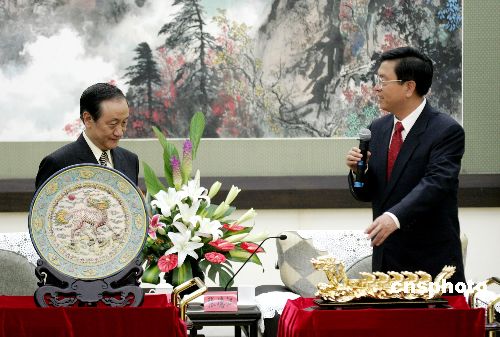 會見結束時,張德江向新黨大陸訪問團贈送了金漆木雕“龍舟”,寓意戮力同心、戰勝困難。新黨大陸訪問團贈送給廣東一件交趾燒“麒麟盤”,取麒麟對抗邪惡之意,據說這種陶器制作法源于廣東,后流傳至臺灣。