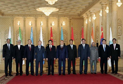 中新網7月8日電 據中國外交部消息,7月5日,在哈薩克斯坦首都阿斯塔納出席上海合作組織峰會的有關領導合影。左五:中國國家主席胡錦濤。