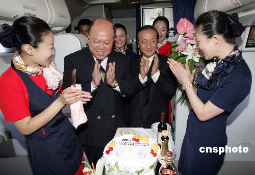 七月十日,南航機(jī)組人員在臺(tái)灣新黨“民族之旅”訪問(wèn)團(tuán)從大連飛往北京的途中,送上蛋糕,祝賀新黨秘書長(zhǎng)李勝峰(左二)生日快樂(lè),并祝訪問(wèn)成功。作者:毛建軍