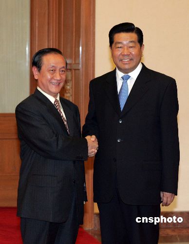 中共中央政治局常委、全國政協主席賈慶林七月十日在北京人民大會堂會見并宴請新黨主席郁慕明率領的臺灣新黨“民族之旅”訪問團。作者:毛建軍
