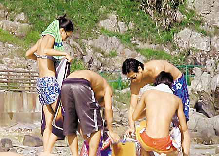 東東身旁雖有身材火熱的美女,但看來(lái)只是他另一位男友人的女伴,期間東東不斷為自己搽太陽(yáng)油,未知他是否羨慕鄰近穿著T-Back泳褲的“黑人”,要狂曬黑自己與黑人媲美。
