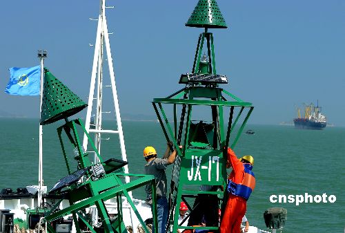 7月12日下午14時,在廈門東南海域離金門大擔島3000米處,一塊5噸重的定錨的沉石落下海中,帶著錨鏈的標有“Jx19”號的浮筒投入水中,上海海事局廈門航標處為廈金航道廈門航段拋下了第一座航標,將結束廈金直航航線“有航線無航道”的狀態。作者:藍添藝