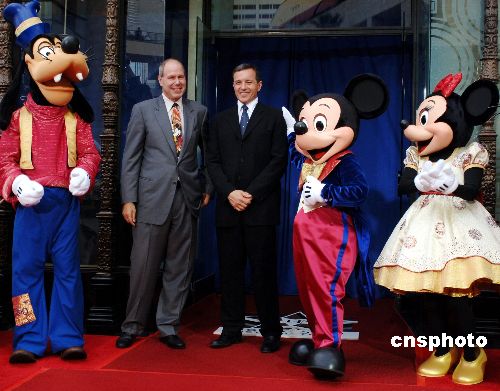 7月14日,迪斯尼公司在好萊塢隆重慶祝美國迪斯尼樂園開業(yè)50周年。迪斯尼總裁羅伯特·依格(右3)和CEO邁克爾·艾森內(nèi)與迪斯尼卡通明星米老鼠、古菲狗一起在星光大道上為慶典開幕。作者:Ic/cnsphoto