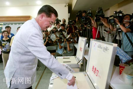 7月16日,中國國民黨主席選舉在全臺601個投票所展開。現任國民黨主席在居家附近的臺北復興中小學參加投票。中新社記者 盛佳鵬