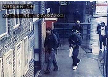 倫敦警察廳16日公布7·7爆炸案嫌疑人錄像,在這張盧頓車站錄像截圖上可看到:哈西卜·侯賽因(左一)、赫爾馬因·林賽(左二黑帽)、穆罕默德·西迪克·汗(白帽)和謝赫扎德·坦維爾在7月7日晨7點21分背包進車站,此后四人在國王十字車站各自走上不歸路