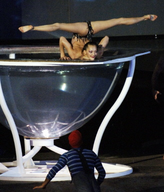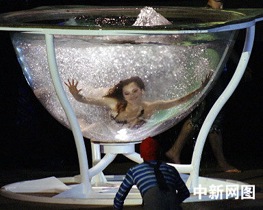 7月16日,2005世界游泳錦標(biāo)賽在加拿大蒙特利爾開(kāi)幕。圖為開(kāi)幕儀式上一名游泳者在圓柱形的容器上表演。