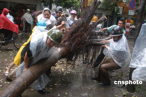 7月18日17時左右,臺風“海棠”的前鋒在福州街頭小試牛刀,將許多綠化樹扳倒在地。福州執勤人員及時清理被大風吹折的樹木。作者:鄭祚聲