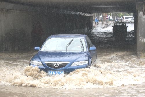 今年第五號臺風"海棠"預計將于七月十九日下午至夜間在福建省沿海登陸。十九日上午福州市區一低洼地帶大雨積水成河,過往車輛行進不暢。作者:劉可耕