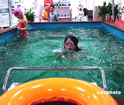 7月21日,在2005中國上海國際環保工業展上,最新亮相的“游泳跑步機”吸引了觀眾注意。這座游泳跑步機需要2.6M0*5.2M的安裝空間,出水速度可選擇,水凈化設備可保障池內水長期循環使用。作者:井韋