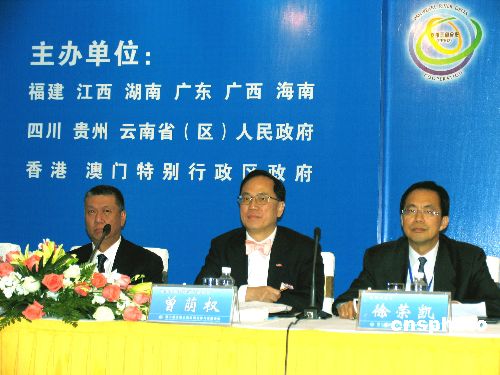 香港特首曾蔭權(中)、澳門特首何厚鏵(右)和云南省省長徐榮凱(左)7月25日出席泛珠論壇記者招待會。作者:陳為民
