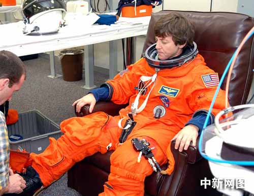 航天飛機(jī)“發(fā)現(xiàn)號”機(jī)組在二十六日早上六時(shí)二十分,開始穿太空服。(NASA供圖)