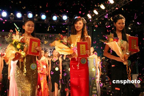 2005年7月29日,中央電視臺、河南電視臺3頻道聯合舉辦的“宋河杯”第六屆CCTV模特電視大賽鄭州賽區預選賽在鄭州拉開帷幕。圖為勝出的3名選手現場接受頒獎。作者:陳代述