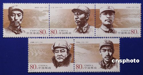 中國國家郵政局定于八月一日發行《人民軍隊早期將領》紀念郵票(一套五枚),特五枚郵票名稱分別為:楊靖宇(上排左一)、左權(上排左二)、彭雪楓(上排左三)、羅炳輝(下排左一)、關向應(下排左二),面值均為八十分。作者:鄒憲