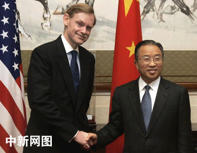中美首輪高層對話于8月1日在北京釣魚臺國賓館舉行,中國外交部副部長戴秉國與美國常務副國務卿佐利克握手。