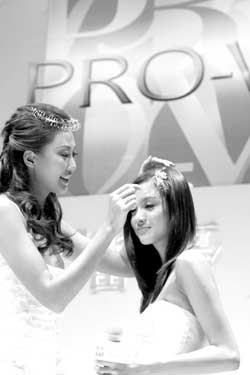 名模謝東娜(左)示范秀發(fā)美鉆配飾