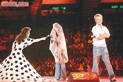 其后,小鳳姐工作人員把頭紗放在盧淑儀頭上,“命令”克勤站在女友身旁,然后把麥克風放在克勤嘴邊說:“你愿意嘛?”又以同一番話詢問盧淑儀:“你又愿意嘛?”全場觀眾無不拍爛手掌和叫囂,雖然小鳳姐一番好意,但克勤卻顯得尷尬萬分,對她說:“我一路自居不結婚的,這是在樂壇屹立多年的秘訣。”