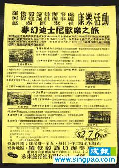 2日,記者在某商場內不同角落,發現張貼了印有276元迪士尼“優惠團”的宣傳單張,由永東旅行社接待,團費包括來回空調車接送。