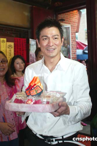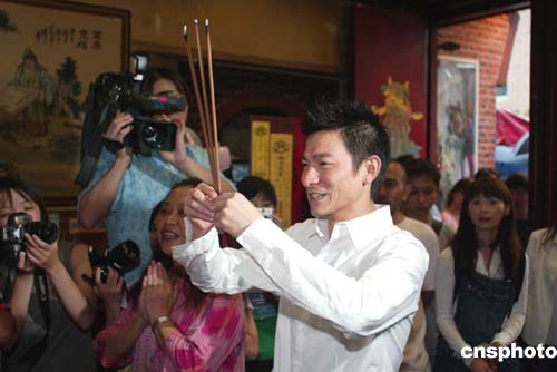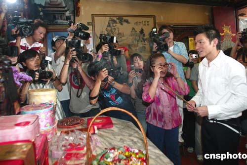 八月四日,著名歌星劉德華來到臺北霞海城隍廟,拜月下老人,同時為歌迷求姻緣線。作者:盛佳鵬