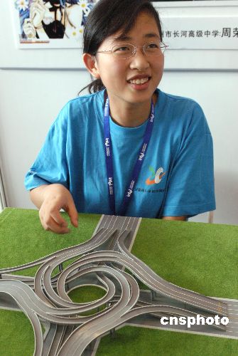八月六日,杭州中學生周榮姝設計的互通式立交橋模型在北京舉行的“第二十屆全國青少年科技創新大賽”上展出。周榮姝的設計方案具有占地面積小、造價低、可靠性高的優點。作者:鄒憲