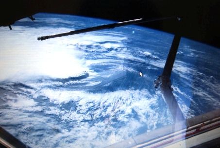 美國發現號在太空圍繞地球家園飛行中,監測一個熱帶風暴正在海洋形成,威脅人類。作者 NASA