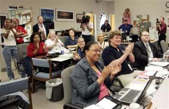 美國宇航局地面控制人員鼓掌祝賀“發(fā)現(xiàn)”號(hào)順利著陸