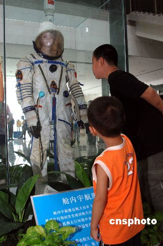 八月十日,在福州舉辦的“飛向太空--中國載人飛天科技展”上,一套價值一億多元人民幣的航天服吸引了眾多觀眾。該航天服能抵御太空環境中各種危害航天員的因素,如真空、無氧、高低溫變化,太陽輻射等。作者:王東明