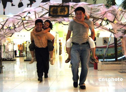 8月11日是“七七情人節(jié)”,在山東濰坊世紀(jì)泰華購物廣場(chǎng),兩對(duì)情侶正在參加背妻比賽。近幾年來,“七七情人節(jié)”受到了越來越多的年輕人的喜愛。許多商家也抓住這一商機(jī),舉辦活動(dòng)吸引人氣,進(jìn)行促銷。作者:王志德