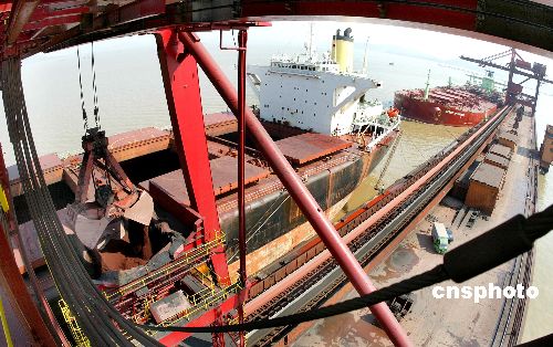 2005年8月11日,據商務部新聞辦公室披露,今年上半年,我國鐵礦石進口1.3億噸,同比增長34.5%,增幅比上年同期回落6個百分點。今年國家出臺有關宏觀調控措施,加強了鐵礦石進口協調,規范了市場秩序,成效顯著,鐵礦石進口達到了預期調控目標。今年我國鐵礦石進口增幅將大幅回落。圖為二艘外國礦砂船正在我國港口卸礦砂。作者:張和平