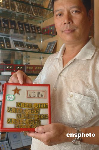 八月十三日,在福州鐵路公安工作二十幾年的揚先生在家里展示收藏的第一代中國人民警察的警銜。楊先生是一位軍銜、警銜的收藏愛好者,至今已經收藏有各類軍銜、警銜上千枚,不少都是收藏界的精品。作者:王東明