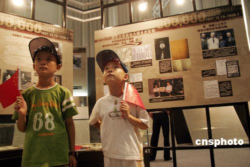 8月10日,兩位小朋友在參觀“12·13———侵華日軍南京大屠殺史實展”。這場以“愛國、正義、和平”為主題,反映南京大屠殺史實的展覽在中國國家博物館舉行。此次展覽是中國抗日戰爭暨世界反法西斯戰爭勝利60周年紀念活動的一部分,80%以上展品都是首次面世。展覽由江蘇省委、省政府主辦,免費對公眾開放,計劃展期20天。作者:陳曉根