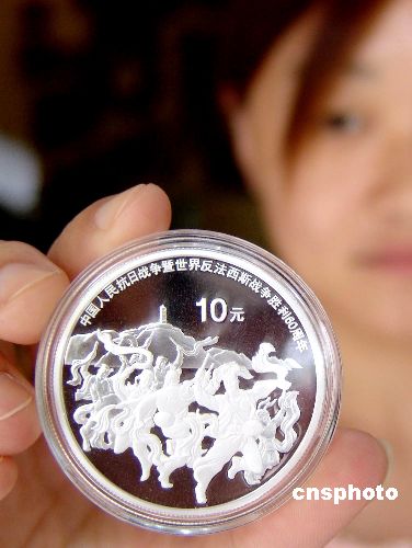 中國人民銀行于2005年8月15日發行中國人民抗日戰爭暨世界反法西斯戰爭勝利60周年金銀紀念幣一套。該套紀念幣共2枚,其中金幣1枚,銀幣1枚,均為中華人民共和國法定貨幣。作者:馬健