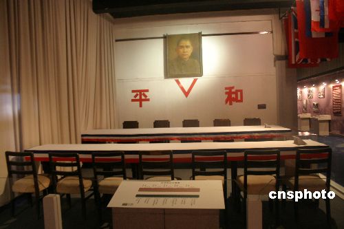 中新社南京八月十五日電(記者 陳光明)以六十年前日軍中國戰(zhàn)區(qū)投降儀式的真實(shí)文物組成的歷史場景,今天再現(xiàn)南京博物院。