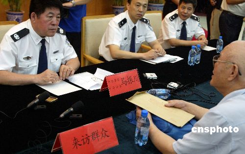 八月十八日,北京市公安局局長馬振川(左)接待來訪的京城市民,傾聽來訪民眾反映的實際問題。今天,北京警方共設立了二十個接待點集中接待來訪市民。作者:任海霞