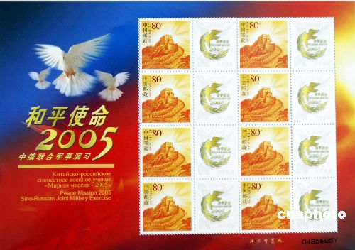 中俄聯合軍事演習導演部和中國集郵總公司19日聯合發行“和平使命—2005”中俄聯合軍事演習紀念封1枚和專題紀念封4枚,以紀念“和平使命—2005”中俄聯合軍事演習。這5枚紀念封以精裝卡書和簡裝卡書兩種方式裝幀。圖為精裝卡書中的一版8枚個性化郵票。作者:王麗南