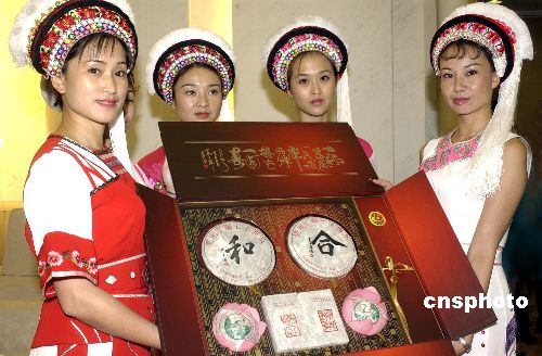 八月二十日,來自云南的白族姑娘在北京人民大會堂向來賓展示“天下和合,兩岸沁香”云南典藏普洱茶。據介紹,此次發行的典藏普洱茶,意在以茶會友,寄情兩岸,企盼祖國早日統一的愿望。作者:韓藝冰