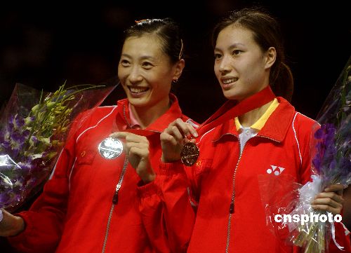 羽毛球世錦賽女單決賽二十一日在美國阿納海姆舉行,世界排名第二的中國選手謝杏芳(右)挑戰衛冕冠軍的頭號種子選手張寧(左)獲得成功,摘到女單桂冠。作者:賈國榮