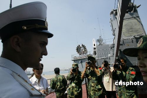 八月二十二日,中國部分媒體被中俄軍事演習俄軍方邀請,參觀采訪此次參加演習的俄羅斯反潛艦,這艘停靠在青島港的艦艇正整裝待發,明日將起航參加海上封鎖演習。圖為中國軍方記者對一位在艦上值勤的俄海軍軍官產生濃厚興趣。作者:王麗南