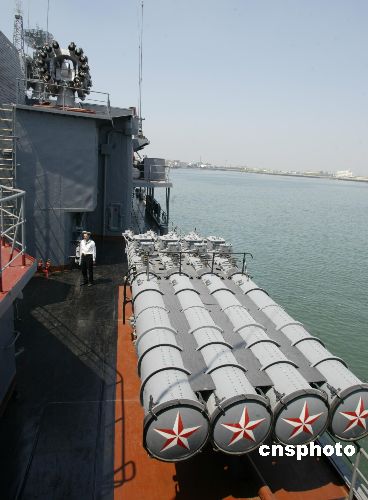 八月二十二日,中國部分媒體被俄軍方邀請,參觀采訪此次參加演習(xí)的俄羅斯反潛艦,這艘停靠在青島港的艦艇正整裝待發(fā),明日將起航參加海上封鎖演習(xí)。圖為反潛艦的一角。作者:王麗南