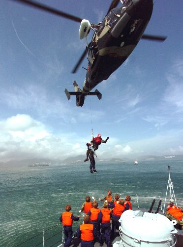中國人民解放軍駐香港部隊(duì)22日在香港南丫島東澳灣參加由特區(qū)政府組織的2005年度海上空難搜救演習(xí)﹐直升飛機(jī)將人從海面救起﹐送上導(dǎo)彈護(hù)衛(wèi)艇。作者:趙振清