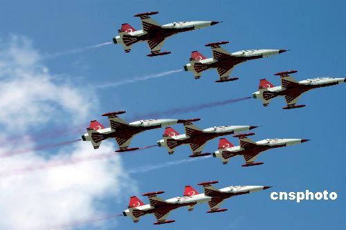 F1大獎賽土耳其站正式比賽結束21日晚。邁凱輪車隊的芬蘭車手雷克南一路領先,并率先完成比賽獲得首屆土耳其大獎賽的冠軍。法拉力車隊的七次世界冠軍舒馬赫因撞車推出了比賽。圖為開幕式上土耳其空軍表演隊列隊表演,為比賽助興。作者:Ic/cnsphoto