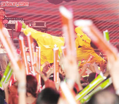 在壓軸合唱部分,達明換了睡袍造型,霆鋒不示弱,即場脫衣拋下臺,露出當年和王菲“比翼雙飛”愛的紋身,又用水淋頭,拗腰彈跳;high到震的他,然后用國語連問兩次站在臺前的大陸fans:“你們會接我嗎?”即飛身下臺,全場嘩然,霆鋒和前排觀眾跌在一堆,形成一個凹字,嚇到正在唱歌的明哥目瞪口呆,馬上叫大會:“停一停音樂。”猛問:“霆鋒有沒事?”現(xiàn)場燈光大,保安和助手紛紛走近察看霆鋒,隔了半分鐘,霆鋒才跳上臺,連鞋都甩開,赤腳說:“不好意思,讓大家擔心,你們有沒事?我還好,如果你們有事,我不會再在香港演出,你們真的OK?”幸沒人受傷,不致樂極生悲。