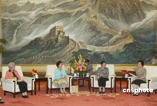 八月二十三日,全國人大常委會副委員長顧秀蓮(右二)、國僑辦主任陳玉杰(右一)在北京人民大會堂會見美大地區華僑華人婦女代表團。來自美洲、大洋洲八個國家的六十余名華僑華人婦女杰出人士是應國務院僑辦的邀請來華訪問的。作者:史利