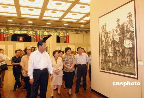 圖:賈慶林、何魯麗參觀“紀念抗戰勝利60周年美術作品展”