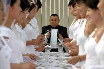 昨天,奧體中心游泳館的一個平臺上,一下子出現了三十位身穿白色婚紗的新娘,這個場面難道是有人在這里組織集體婚禮?看到一旁的攝影機,才知道原來這里是潘長江處女專輯《男人40一枝花》同名歌曲MV的拍攝現場。一張長條桌子兩側站著30位漂亮的新娘,而眾星捧月之中是身穿黑色燕尾服的笑星潘長江。最搞笑的是當老潘揭開面前一只巨大的盤子蓋,原以為是大餐的他失望地發現里面只放著一個小漢堡。