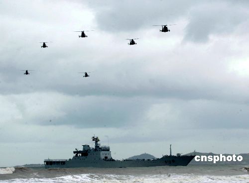 八月二十四日,“和平使命—2005”中俄聯合軍事演習兩棲登陸作戰實兵演練在山東半島展開。圖為參加兩棲登陸作戰演練的直升機在風云變幻的海天間掩護俄羅斯艦艇前進。作者:王麗南
