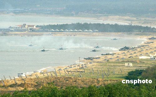 八月二十四日,“和平使命—2005”中俄聯(lián)合軍事演習(xí)第三階段兩棲登陸作戰(zhàn)實兵演練在山東半島展開。圖為兩棲登陸作戰(zhàn)實兵演練的裝甲車向岸防沖擊。作者:王麗南