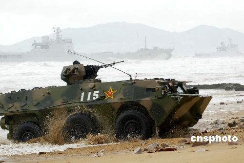 八月二十四日,盡管山東半島天氣惡劣“和平使命—2005”中俄聯合軍事演習兩棲登陸作戰實兵演練如期進行。圖為參加兩棲登陸作戰演練的裝甲車搶灘登陸。作者:王麗南